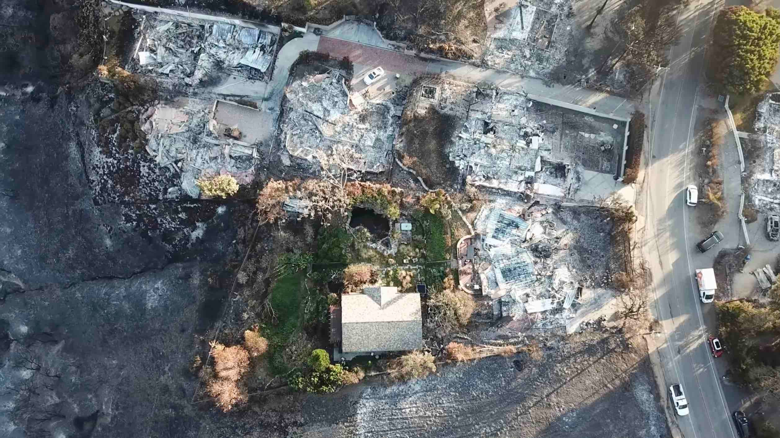 Die Luftaufnahme, zeigt ein Gebäude inmitten eines grünen Gartens, inmitten einer asche-grau verbrannten Umgebung. Nicht irgendein Gebäude, sondern ein Aufnahme-Studio. Woodshed Recording in Malibu, Kalifornien. In diesem “Holzhaus” haben die bekanntesten Acts Musik aufgenommen…