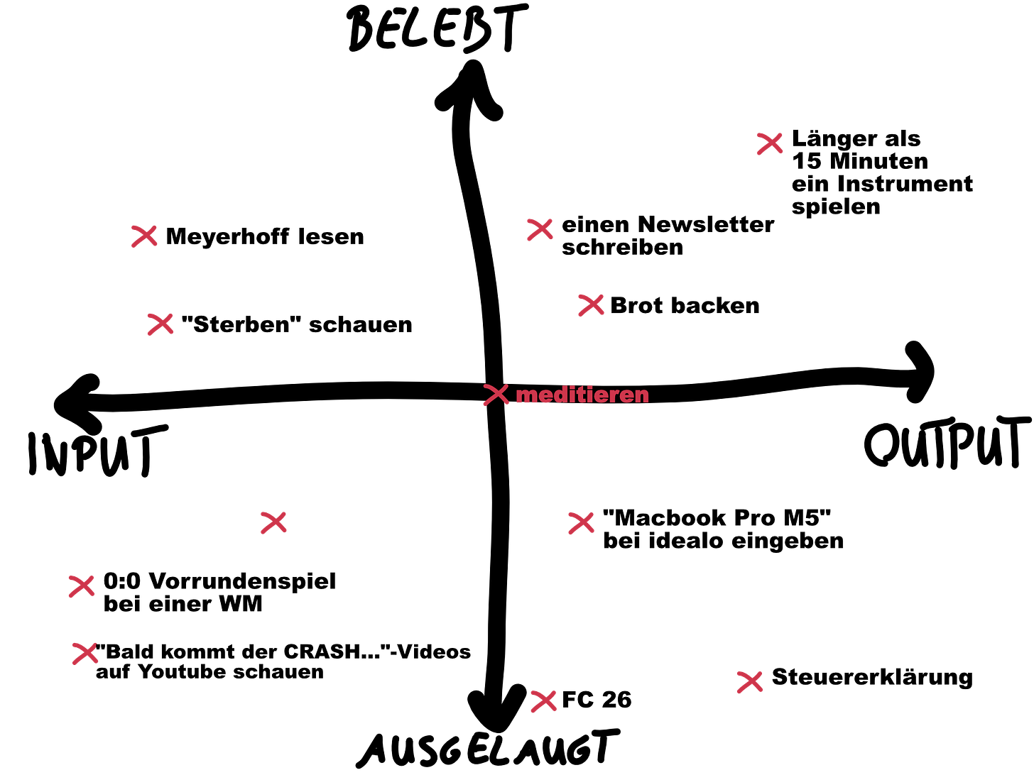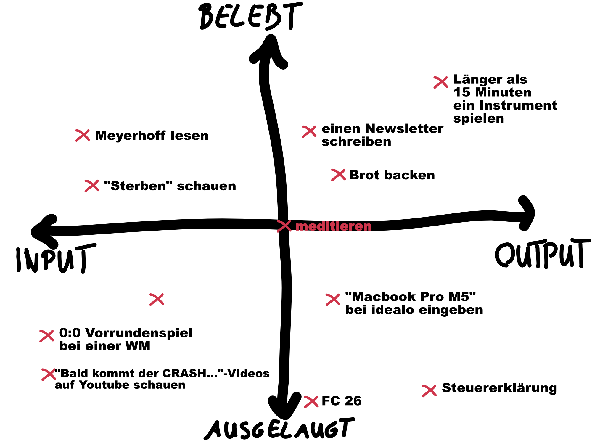 Mehr Output als Input. In der heutigen Zeit fast unmöglich. Und ja, man könnte argumentieren, dass unsere Jobs “Output” sind. Aber acht Stunden im Call Center genervten Menschen erklären, wie sie den Router einrichten (ein Beispiel), ist aber eben Output der auslaugt.
